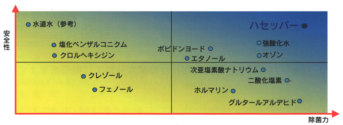 好中球は細菌が侵入すると、酸素代謝を活発に行なって、活性酸素を作り出します。この活性酸素を元にして、過酸化水素(H2O2)を合成し、更に酵素の働きを受けて次亜塩素酸(HCIO)を作り、この次亜塩素酸で菌の膜を攻撃し死滅させて、最近の体内組織への侵入を防いでいます。好中球が生成するこの次亜塩素酸(HCIO)を大量に含む除菌水を、科学的に合成し、大量に安定的に生産できるシステムがハセッパーです。
